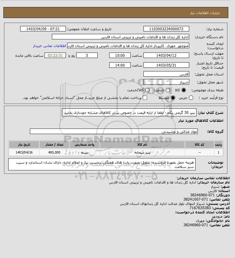 شرح کلی نیاز: پنیر 30 گرمی پگاه - لطفا از ارایه قیمت در خصوص سایر کالاهای مشابه خودداری نمایید