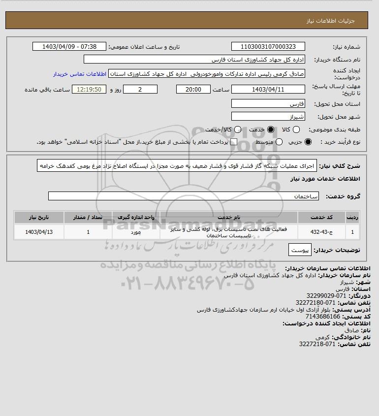 استعلام اجرای عملیات شبکه گاز فشار قوی و فشار ضعیف به صورت مجزا در ایستگاه اصلاح نژاد مرغ بومی کفدهک خرامه, استعلام اجرای عملیات شبکه گاز فشار قوی و فشار ضعیف به صورت مجزا در ایستگاه اصلاح نژاد مرغ بومی کفدهک خرامه