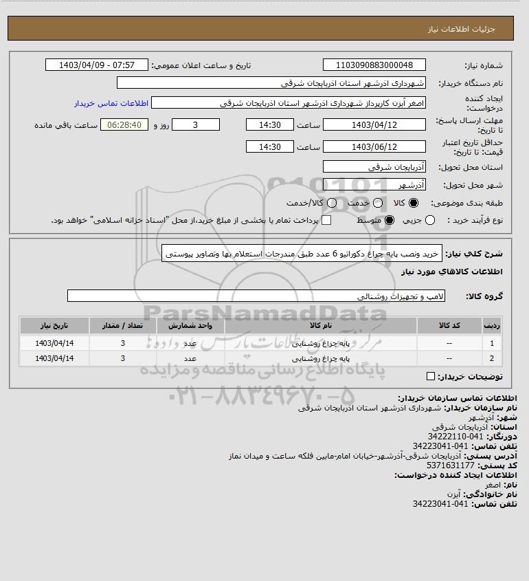 شرح کلی نیاز: خرید ونصب پایه چراغ دکوراتیو 6 عدد طبق مندرجات استعلام بها وتصاویر پیوستی