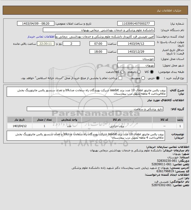توضیحات خریدار:پروب پالس مانیتور اطفال 10 عدد برند saadat شرکت پویندگان راه سعادت مدلb9 و تعداد سنسور پالس مانیتورینگ بخش nicuپرداخت 4 ماهه تحویل درب بیمارستان