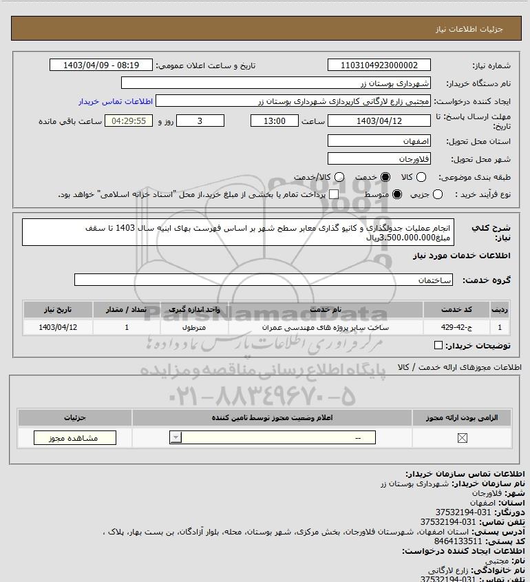 شرح کلی نیاز: انجام عملیات جدولگذاری و کانیو گذاری معابر سطح شهر بر اساس فهرست بهای ابنیه سال 1403 تا سقف مبلغ3.500.000.000ریال
