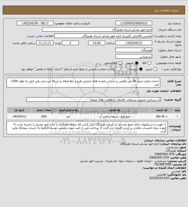 شرح کلی نیاز: احداث مخزن بتنی 24 متر مکعبی بر اساس نقشه های اجرایی طرح و خط انتقال و شبکه آبرسانی پلی اتیلن به طول 1500 متر.