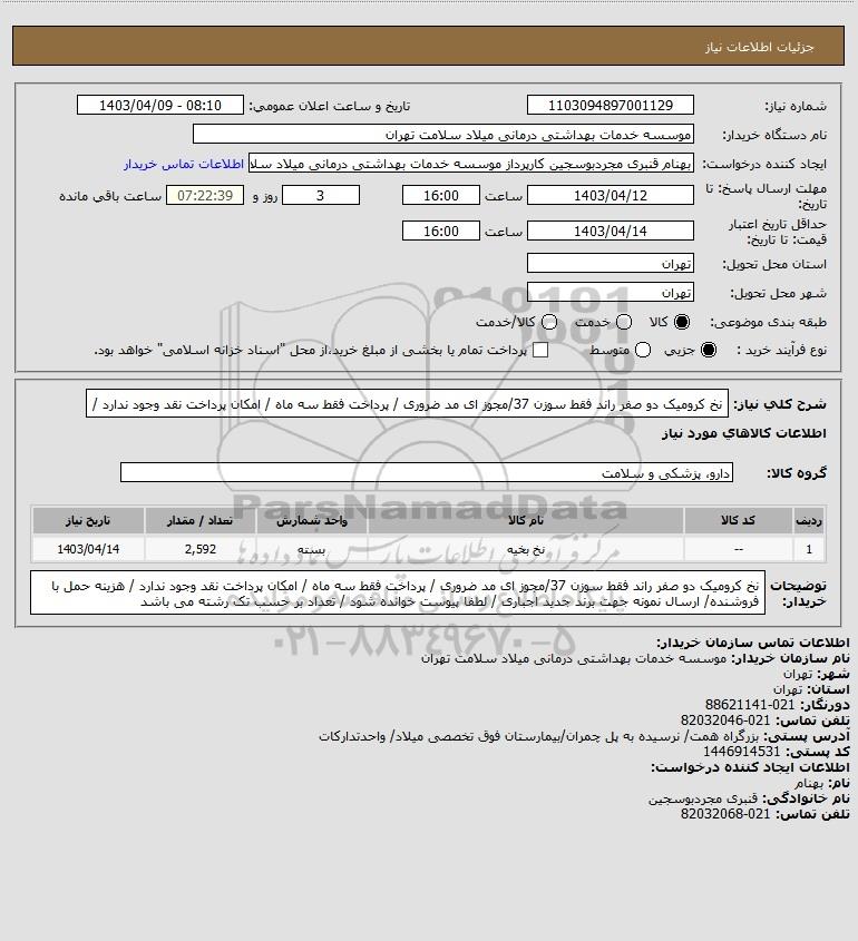 شرح کلی نیاز: نخ کرومیک دو صفر راند فقط سوزن 37/مجوز ای مد ضروری / پرداخت فقط سه ماه / امکان پرداخت نقد وجود ندارد /