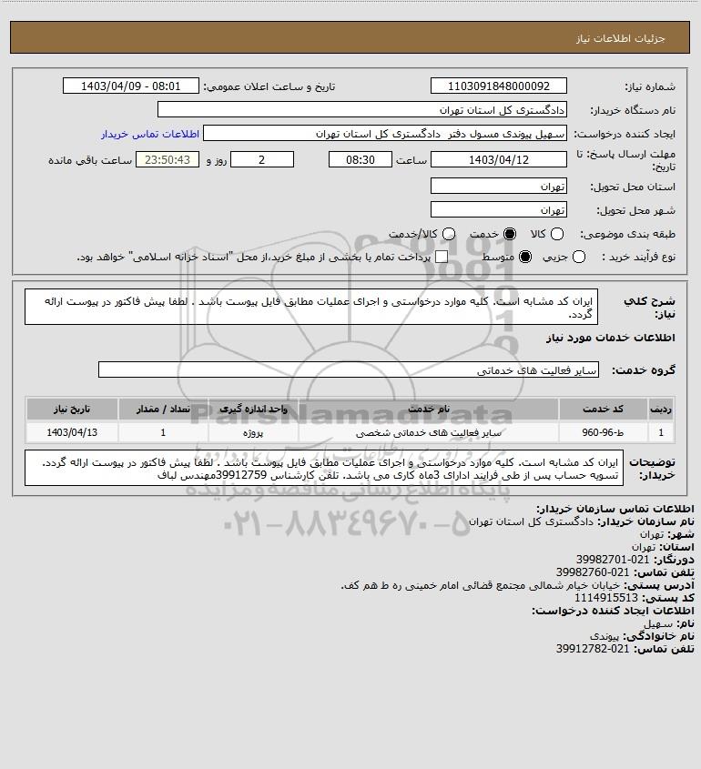 استعلام ایران کد مشابه است. کلیه موارد درخواستی و اجرای عملیات مطابق فایل پیوست باشد . لطفا پیش فاکتور در پیوست ارائه گردد., استعلام ایران کد مشابه است. کلیه موارد درخواستی و اجرای عملیات مطابق فایل پیوست باشد . لطفا پیش فاکتور در پیوست ارائه گردد.