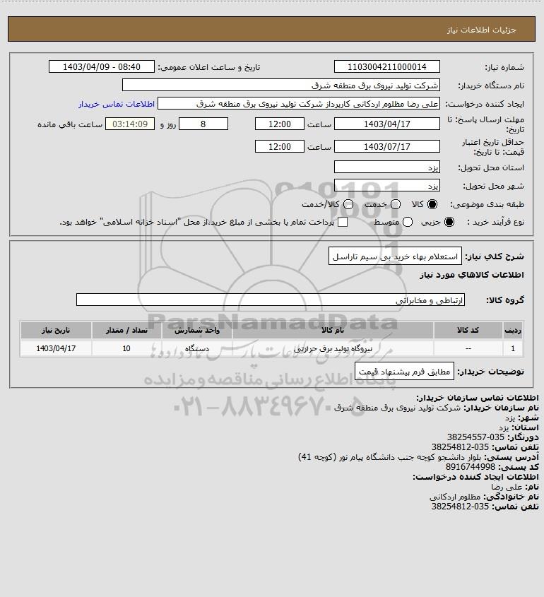 | 1 | -- | نیروگاه تولید برق حرارتی | دستگاه | 10 | 1403/04/17 |
