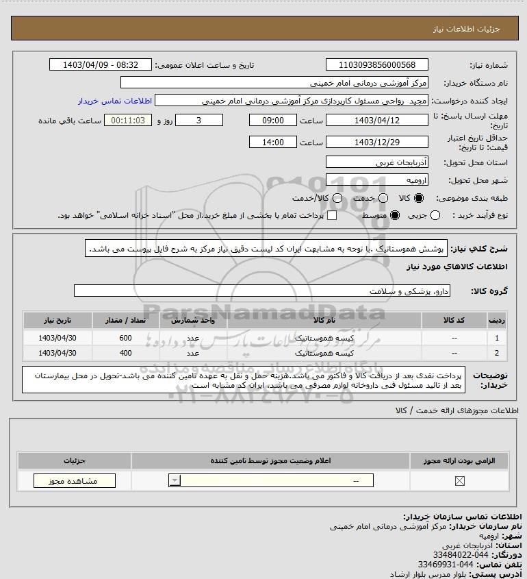 | 2 | -- | کیسه هموستاتیک | عدد | 400 | 1403/04/30 |