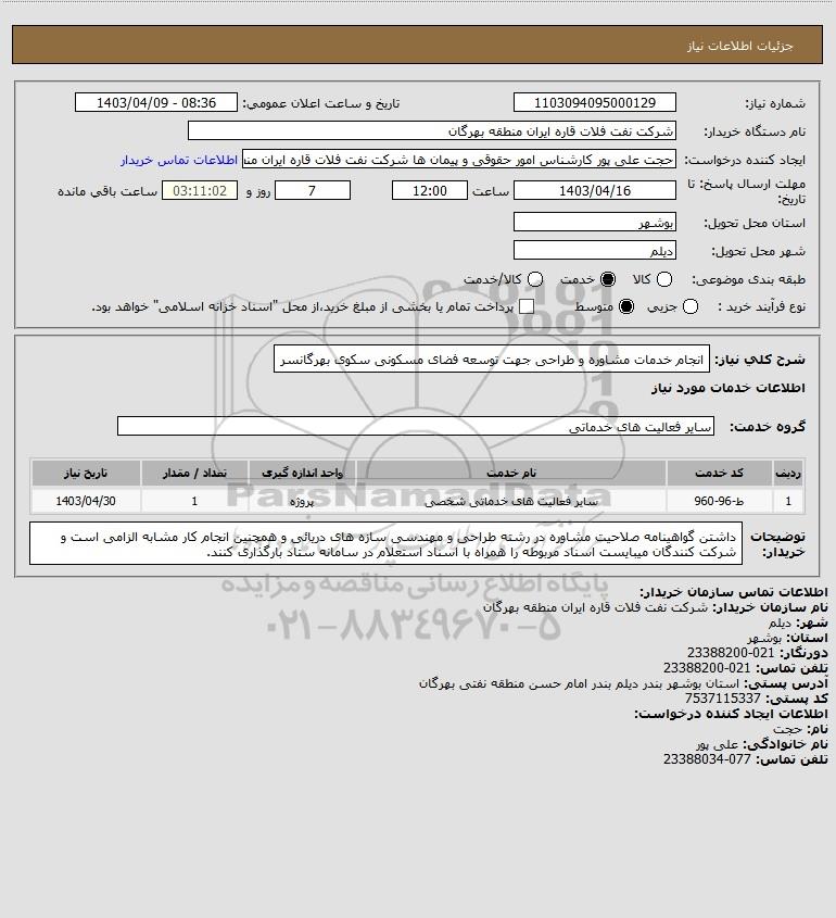 شرح کلی نیاز: انجام خدمات مشاوره و طراحی جهت توسعه فضای مسکونی سکوی بهرگانسر