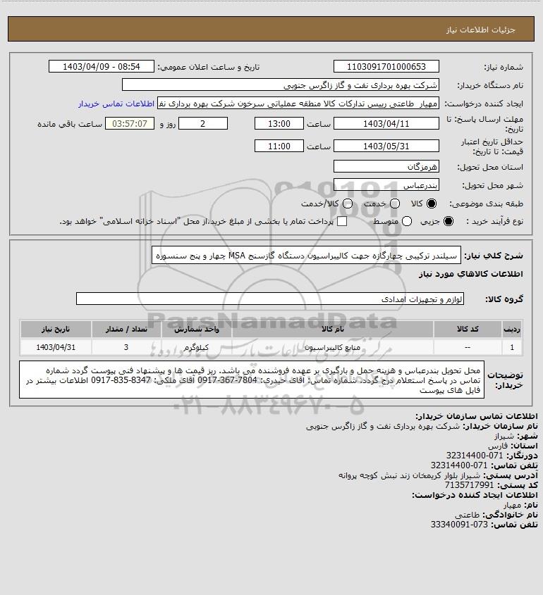 شرح کلی نیاز: سیلندر ترکیبی چهارگازه جهت کالیبراسیون دستگاه گازسنج MSA چهار و پنج سنسوره
