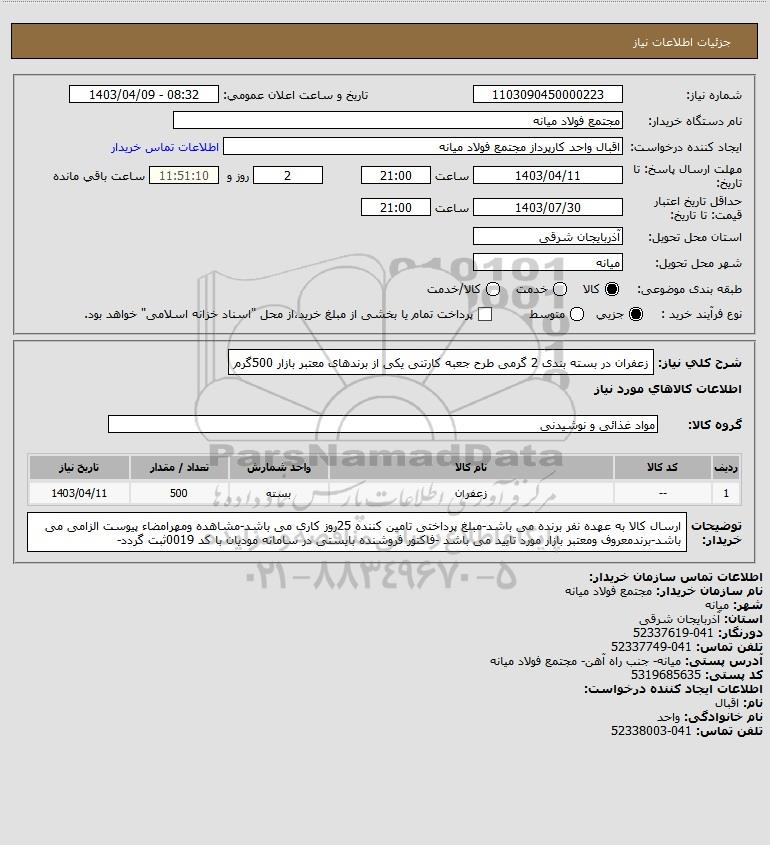 استعلام بها و موضوع استعلام استعلام زعفران در بسته بندی 2 گرمی طرح جعبه کارتنی یکی از برندهای معتبر بازار 500گرم به اطلاع کلیه شرکت‌ها و افراد متخصص واجد شرایط می‌رساند، آگهی گذار در نظر دارد از طریق استعلام بها، نسبت به انتخاب و دریافت پیشنهادات اقدام نماید. این استعلام با کد آگهی ثبت شده در سامانه خبرگزاری پارس نماد : 7655847 منتشر شده است. مشخصات استعلام : تاریخ شروع استعلام: 1403/04/09 آخرین مهلت ارسال پیشنهاد قیمت : 1403/04/11 و محل اجرای پروژه : استان آذربایجان شرقی میباشد. استعلام قیمت مورد درخواست : استعلام زعفران در بسته بندی 2 گرمی طرح جعبه کارتنی یکی از برندهای معتبر بازار 500گرم با دسته‌بندی‌های تخصصی و گروه های مرتبط : مواد غذایی, استعلام اطلاع رسانی میگردد.