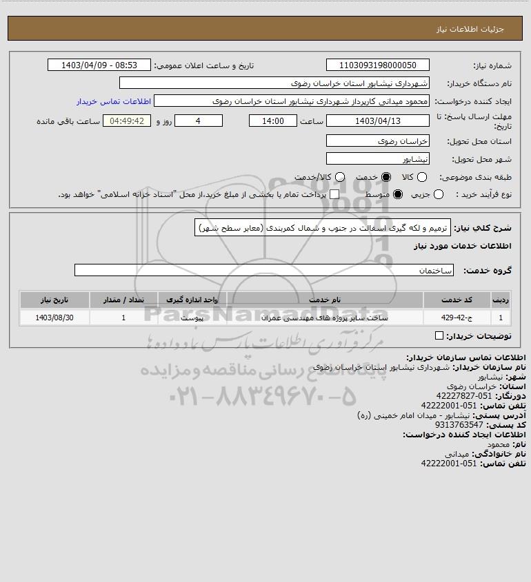 شرح کلی نیاز: ترمیم و لکه گیری اسفالت در جنوب و شمال کمربندی (معابر سطح شهر)