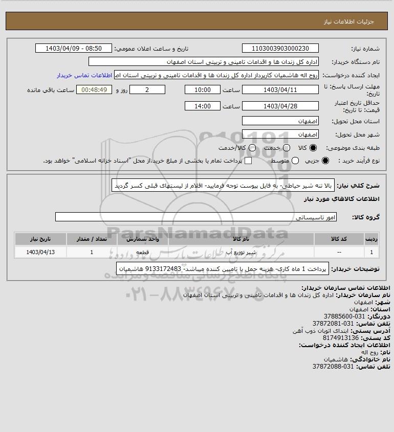شرح کلی نیاز: بالا تنه شیر حیاطی- به فایل پیوست توجه فرمایید- اقلام از لیستهای قبلی کسر گردید