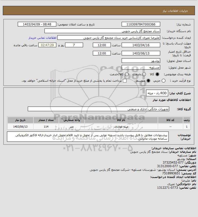 اسناد مناقصه استعلام ROD راد - میله به علت اتمام مهلت شرکت در مناقصه از روی وب سایت برداشته شده است. برای رویت اسناد جدید به صفحه اسناد مناقصه مزایده مراجعه کنید.