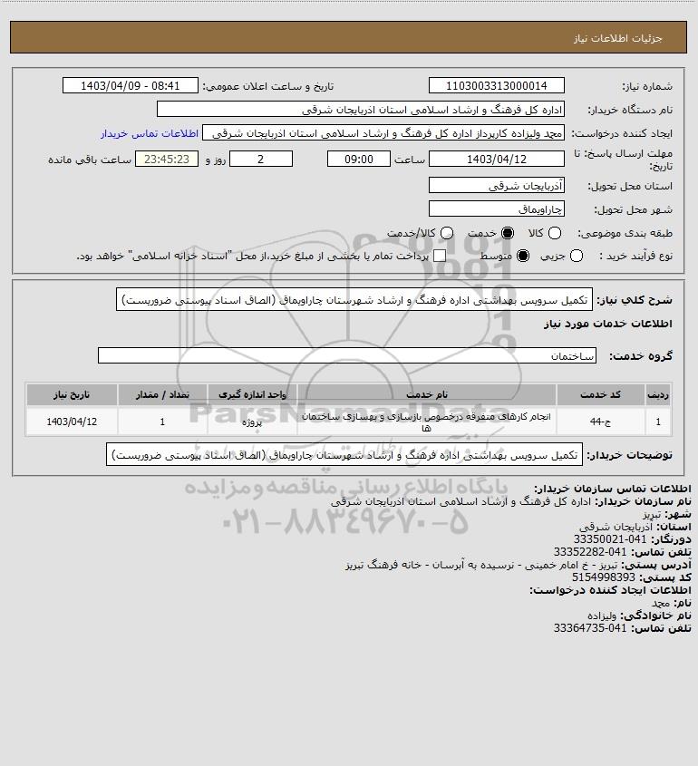 شرح کلی نیاز: تکمیل سرویس بهداشتی اداره فرهنگ و ارشاد شهرستان چاراویماق (الصاق اسناد پیوستی ضروریست)