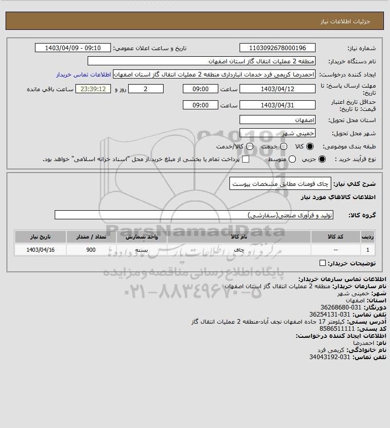 شرح کلی نیاز: چای فومنات مطابق مشخصات پیوست