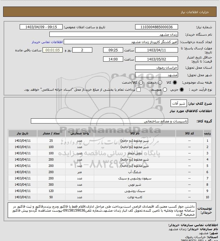 استعلام بها و موضوع استعلام استعلام شیر آلات به اطلاع کلیه شرکت‌ها و افراد متخصص واجد شرایط می‌رساند، آگهی گذار در نظر دارد از طریق استعلام بها، نسبت به انتخاب و دریافت پیشنهادات اقدام نماید. این استعلام با کد آگهی ثبت شده در سامانه خبرگزاری پارس نماد : 7656023 منتشر شده است. مشخصات استعلام : تاریخ شروع استعلام: 1403/04/09 آخرین مهلت ارسال پیشنهاد قیمت : 1403/04/11 و محل اجرای پروژه : استان خراسان رضوی میباشد. استعلام قیمت مورد درخواست : استعلام شیر آلات با دسته‌بندی‌های تخصصی و گروه های مرتبط : انواع شیلنگ, تاسیسات ساختمانی, شیرآلات, سرویس های بهداشتی, استعلام اطلاع رسانی میگردد.