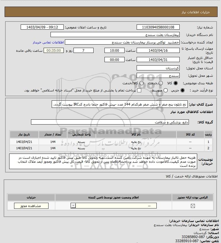 استعلام نخ نایلون پنج صفر و شش صفر هرکدام 144 عدد -پیش فاکتور حتما بادرج کدIRC پیوست گردد., استعلام نخ نایلون پنج صفر و شش صفر هرکدام 144 عدد -پیش فاکتور حتما بادرج کدIRC پیوست گردد.