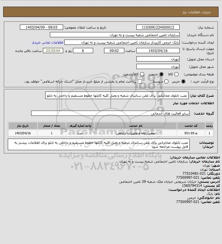 شرح کلی نیاز: نصب تابلوی مخابراتی برای تلفن سانترال شعبه و وصل کلیه کابلها خطوط مستقیم و داخلی به تابلو