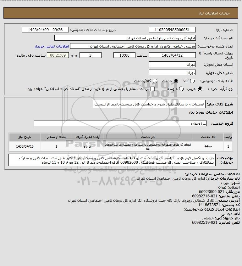 شرح کلی نیاز: تعمیرات و بازسازی طبق شرح درخواست فایل پیوست-بازدید الزامیست