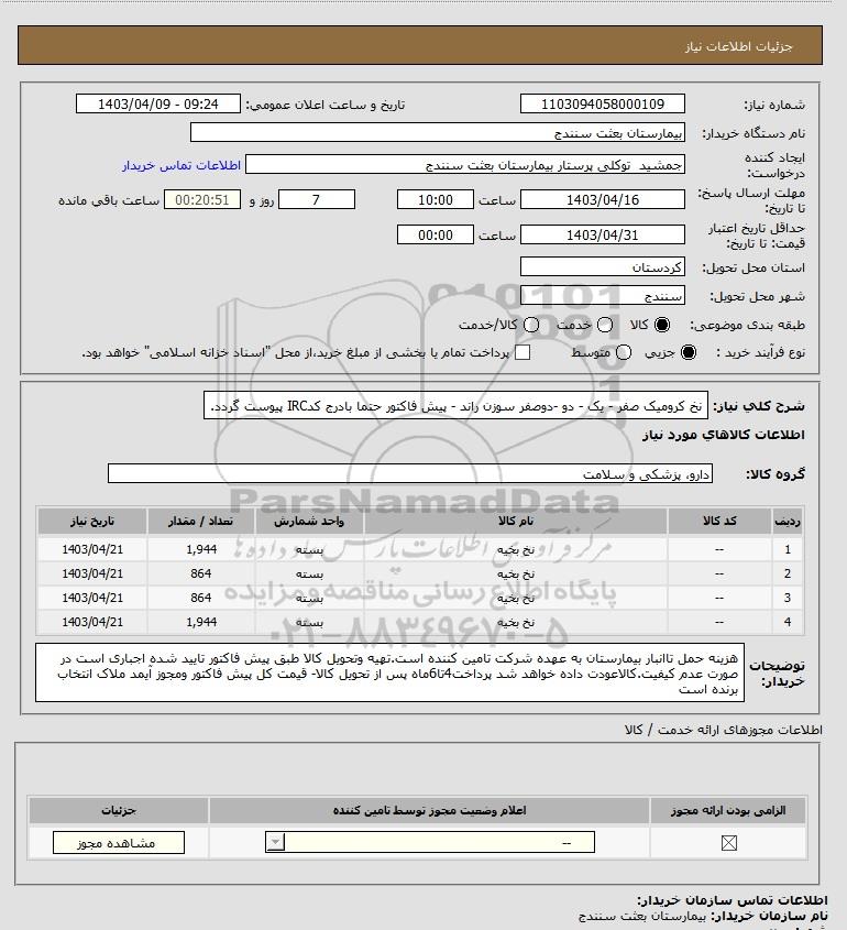 شرح کلی نیاز: نخ کرومیک صفر - یک - دو -دوصفر سوزن راند - پیش فاکتور حتما بادرج کدIRC پیوست گردد.