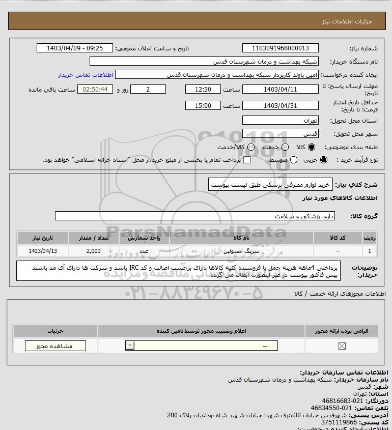 | 1 | -- | سرنگ انسولین | عدد | 2,000 | 1403/04/13 |