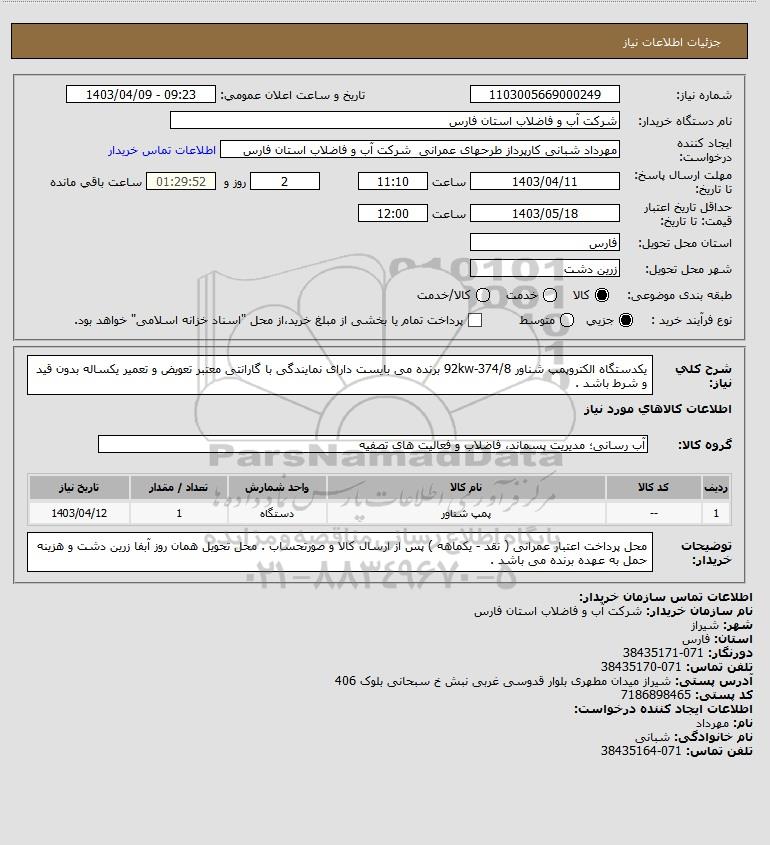 نام دستگاه خریدار:شرکت آب و فاضلاب استان فارس