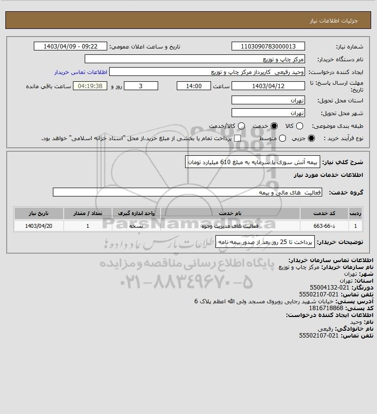 شرح کلی نیاز: بیمه آتش سوزی با سرمایه به مبلغ 610 میلیارد تومان