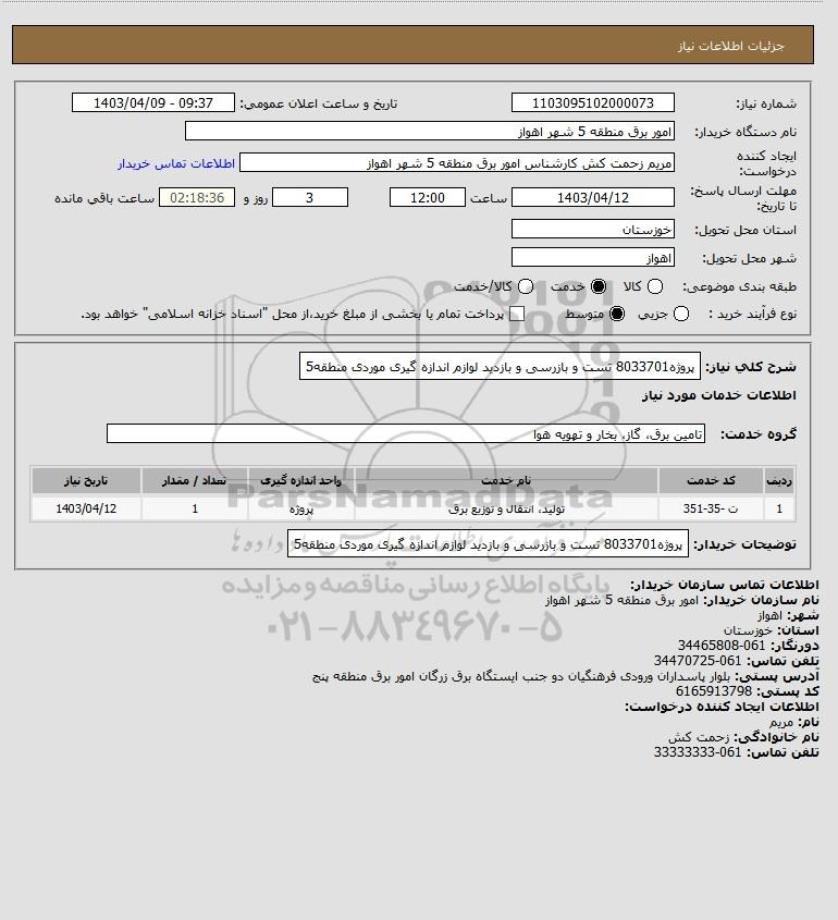 شرح کلی نیاز: پروژه8033701 تست و بازرسی و بازدید لوازم اندازه گیری موردی منطقه5