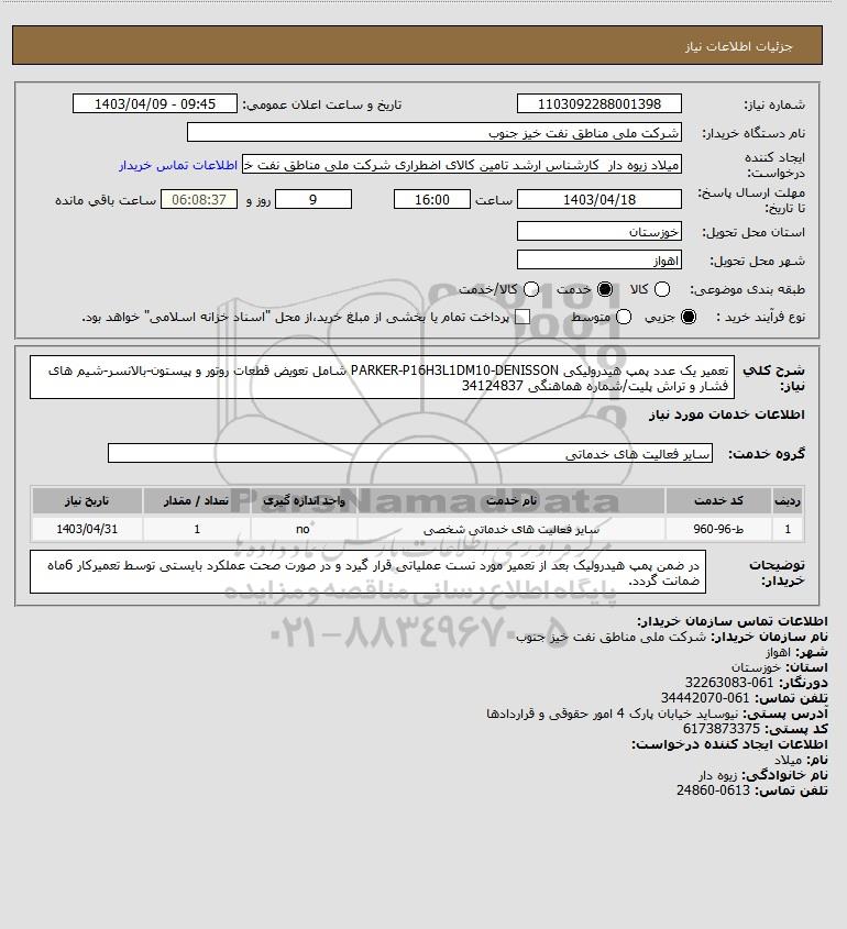 استعلام تعمیر یک عدد پمپ هیدرولیکی PARKER-P16H3L1DM10-DENISSON شامل تعویض قطعات روتور و پیستون-بالانسر-شیم های فشار و تراش پلیت/شماره هماهنگی 34124837, استعلام تعمیر یک عدد پمپ هیدرولیکی PARKER-P16H3L1DM10-DENISSON شامل تعویض قطعات روتور و پیستون-بالانسر-شیم های فشار و تراش پلیت/شماره هماهنگی 34124837