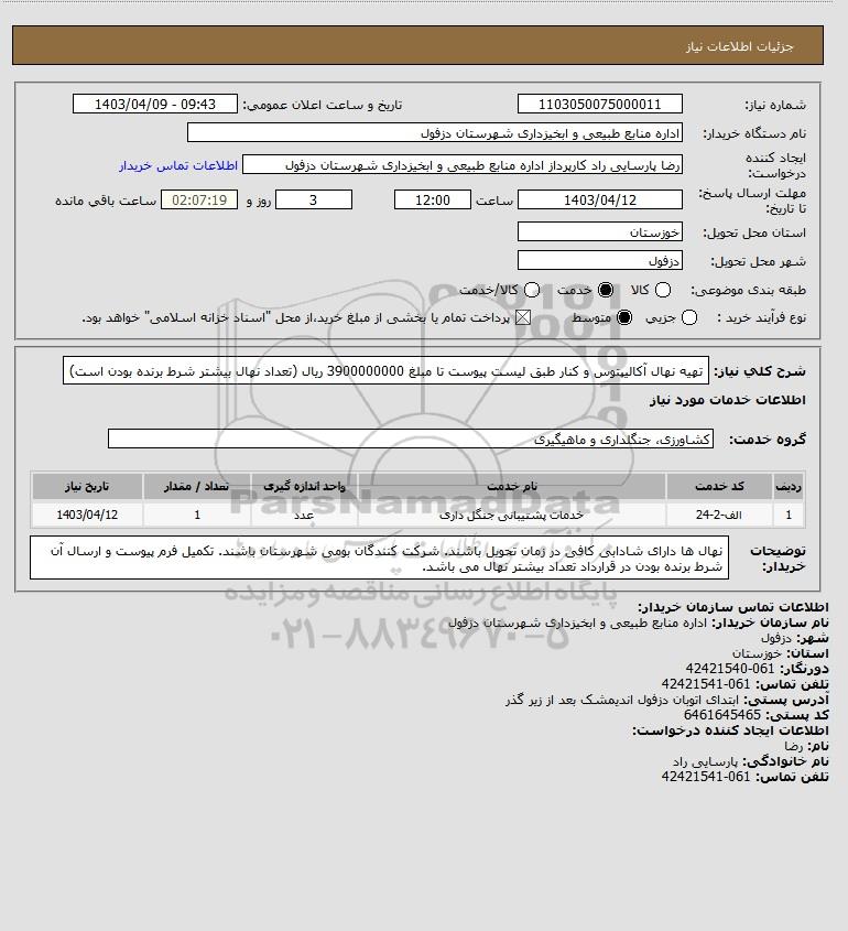 نام دستگاه خریدار:اداره منابع طبیعی و ابخیزداری شهرستان دزفول