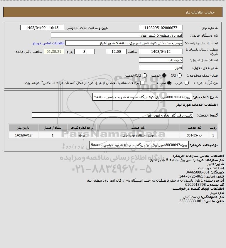 شرح کلی نیاز: پروژه8030047تامین برق کوی زرگان مدرسه شهید دیلمی منطقه5