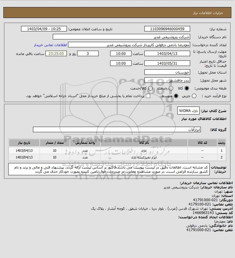 | 2 | -- | ابزار تمیزکننده نازل | عدد | 10 | 1403/04/13 |