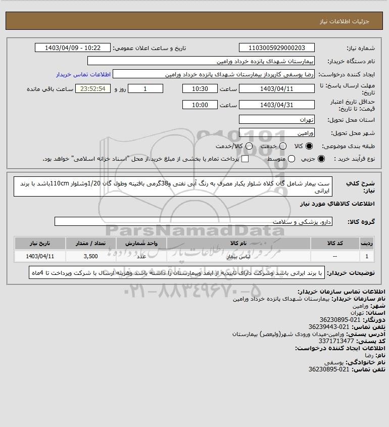 شرح کلی نیاز: ست بیمار شامل گان کلاه شلوار یکبار مصرف به رنگ آبی نفتی و38گرمی بافتینه وطول گان 1/20وشلوار 110cmباشد با برند ایرانی