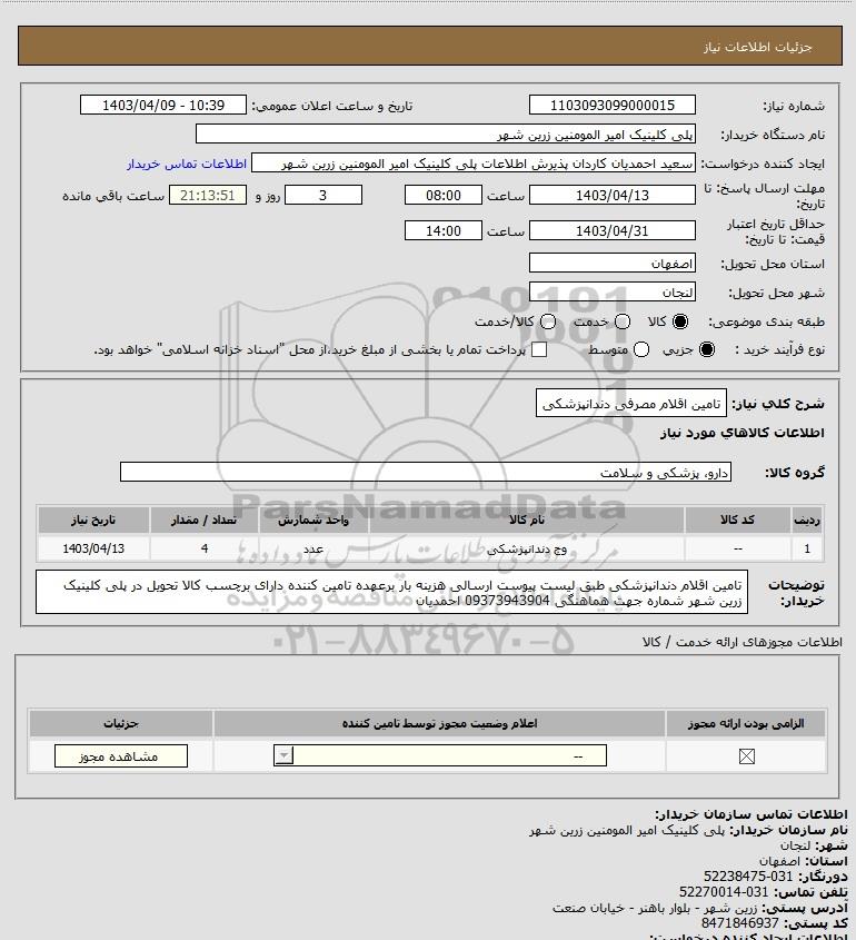 استعلام بها و موضوع استعلام استعلام تامین اقلام مصرفی دندانپزشکی به اطلاع کلیه شرکتها و افراد متخصص واجد شرایط میرساند، آگهی گذار در نظر دارد از طریق استعلام بها، نسبت به انتخاب و دریافت پیشنهادات اقدام نماید. این استعلام با کد آگهی ثبت شده در سامانه خبرگزاری پارس نماد : 7657243 منتشر شده است. مشخصات استعلام : تاریخ شروع استعلام: 1403/04/09 آخرین مهلت ارسال پیشنهاد قیمت : 1403/04/13 و محل اجرای پروژه : استان اصفهان میباشد. استعلام قیمت مورد درخواست : استعلام تامین اقلام مصرفی دندانپزشکی با دستهبندیهای تخصصی و گروه های مرتبط : خدمات و تجهیزات آزمایشگاهی و پزشکی, استعلام اطلاع رسانی میگردد.