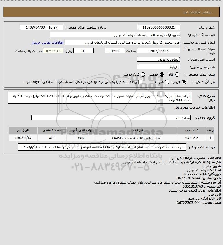 شرح کلی نیاز: انجام عملیات بلوک بندی شهر و انجام عملیات ممیزی املاک و مستحدثات و تطبیق و ادغاماطلاعات املاک واقع در محله 7 به تعداد 800 واحد