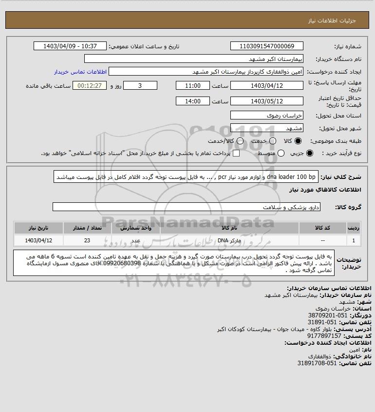 شرح کلی نیاز: dna loader 100 bp و لوازم مورد نیاز pcr , ... به فایل پیوست توجه گردد اقلام کامل در فایل پیوست میباشد