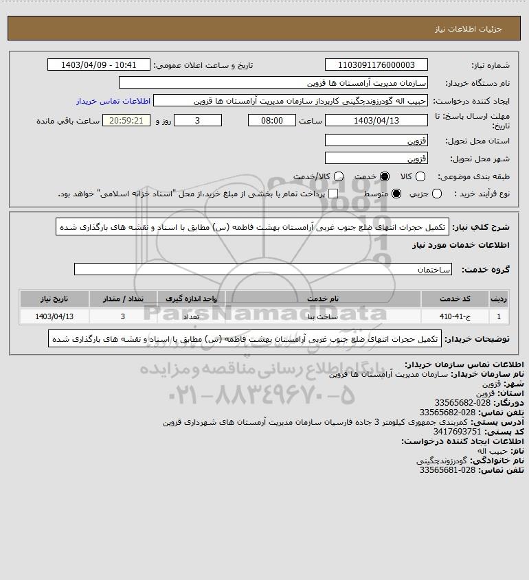 شرح کلی نیاز: تکمیل حجرات انتهای ضلع جنوب غربی آرامستان بهشت فاطمه (س) مطابق با اسناد و نقشه های بارگذاری شده