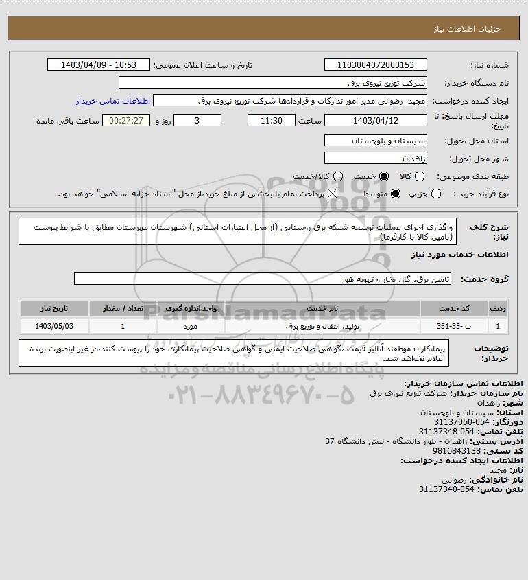 شرح کلی نیاز: واگذاری اجرای عملیات توسعه شبکه برق روستایی (از محل اعتبارات استانی) شهرستان مهرستان مطابق با شرایط پیوست (تامین کالا با کارفرما)