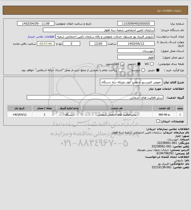 شرح کلی نیاز: تعویض کمپرسور و تعمیر کولر دوتیکه سه دستگاه