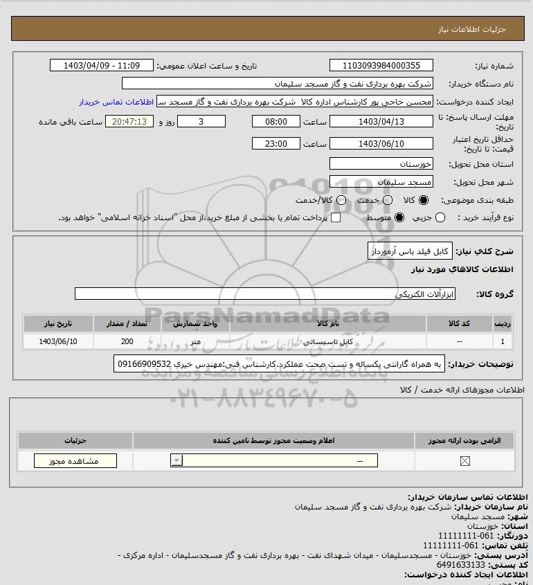 | 1 | -- | کابل تاسیساتی | متر | 200 | 1403/06/10 |
