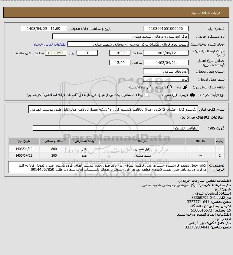 استعلام 1.سیم کابل افشان 3*2.5به متراژ 800متر 2.سیم کابل 3*1.5به مقدار 200متر مدل کابل طبق پیوست الصاقی, استعلام 1.سیم کابل افشان 3*2.5به متراژ 800متر 2.سیم کابل 3*1.5به مقدار 200متر مدل کابل طبق پیوست الصاقی
