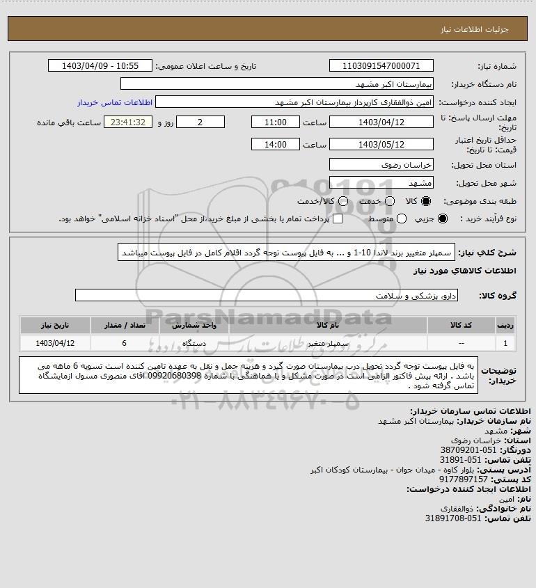 نام دستگاه خریدار:بیمارستان اکبر مشهد