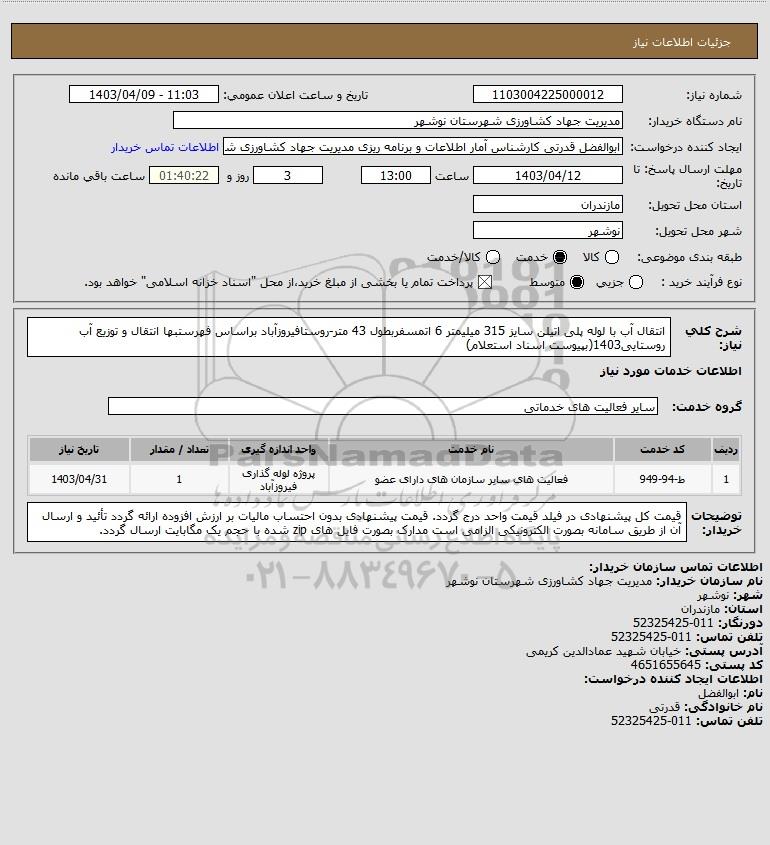 شرح کلی نیاز: انتقال آب با لوله پلی اتیلن سایز 315 میلیمتر 6 اتمسفربطول 43 متر-روستافیروزآباد براساس فهرستبها انتقال و توزیع آب روستایی1403(بپیوست اسناد استعلام)