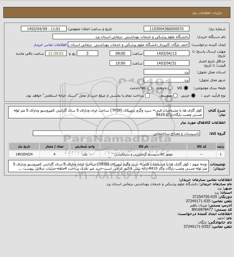 شرح کلی نیاز: کولر گازی ها با مشخصات فنی= سرد وگرم تروپیکال (TP39) ساخت ایران ودارای 5 سال گارانتی کمپروسور ودارای 5 متر لوله مسی ونصب رایگان وگاز R410