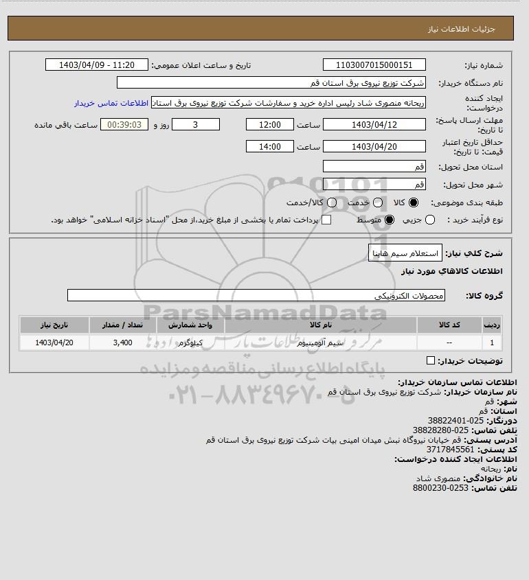 1 -- سیم آلومینیوم کیلوگرم 3,400 1403/04/20