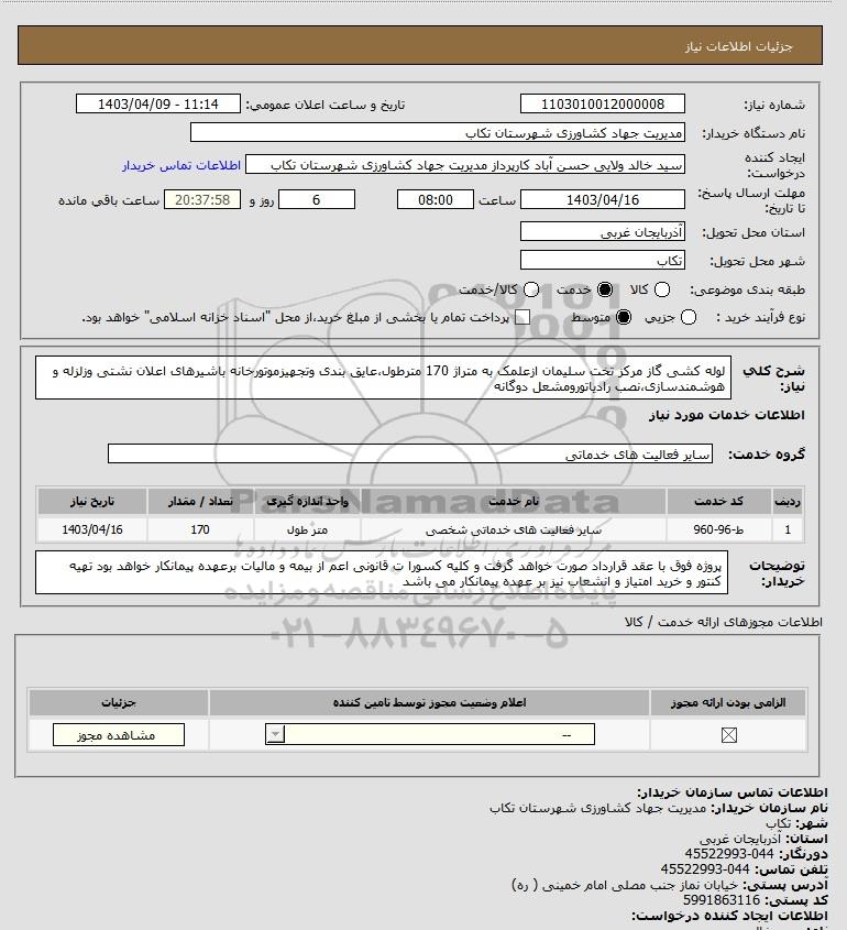 شرح کلی نیاز: لوله کشی گاز مرکز تخت سلیمان ازعلمک به متراژ 170 مترطول،عایق بندی وتجهیزموتورخانه باشیرهای اعلان نشتی وزلزله و هوشمندسازی،نصب رادیاتورومشعل دوگانه