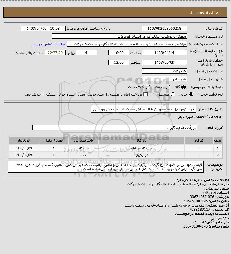 نام دستگاه خریدار:منطقه 6 عملیات انتقال گاز در استان هرمزگان