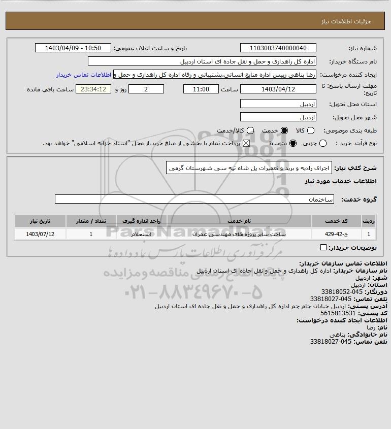 شرح کلی نیاز: اجرای رادیه و برید و تعمیرات پل شاه تپه سی شهرستان گرمی