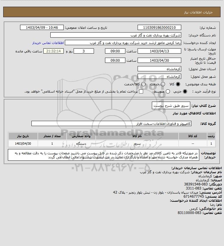 شرح کلی نیاز: سرور طبق شرح پیوست