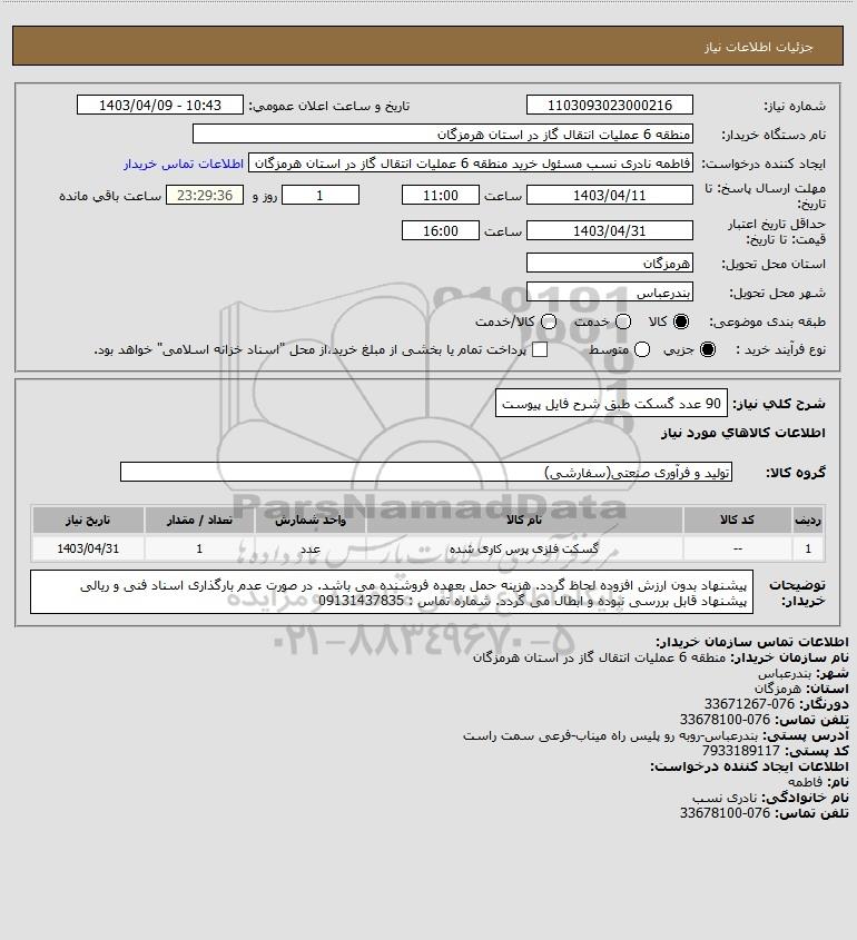 شرح کلی نیاز: 90 عدد گسکت طبق شرح فایل پیوست