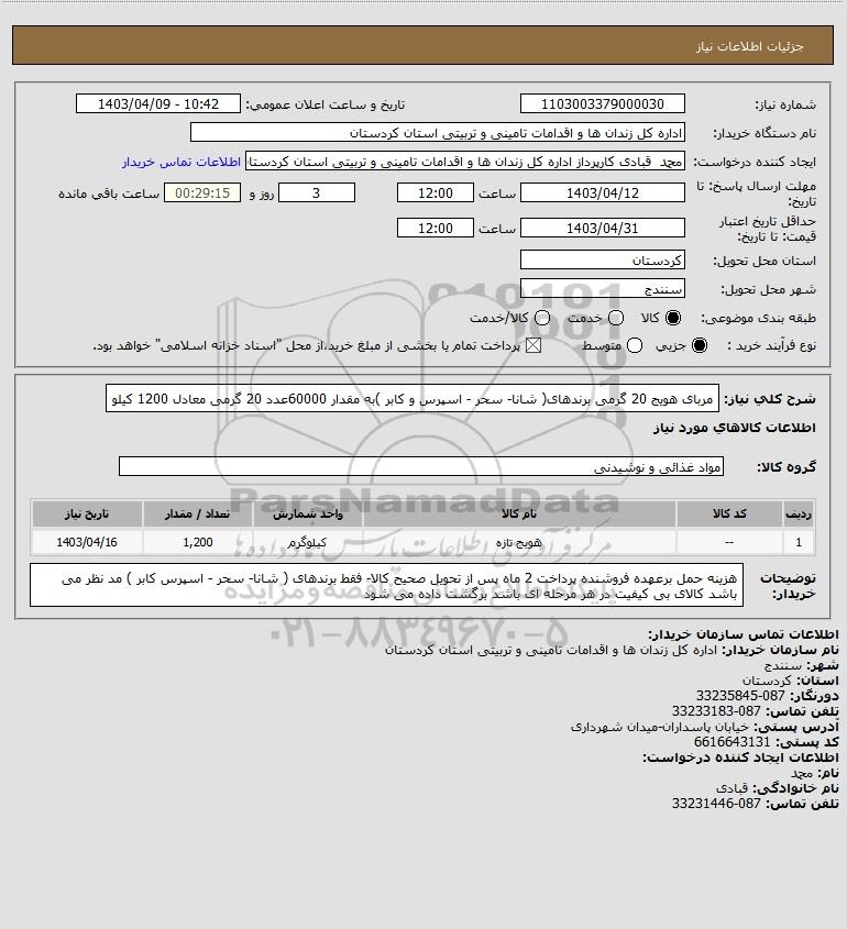 نام دستگاه خریدار:اداره کل زندان ها و اقدامات تامینی و تربیتی استان کردستان